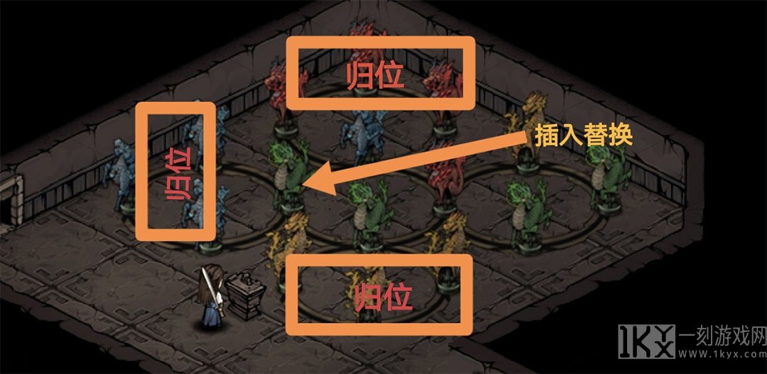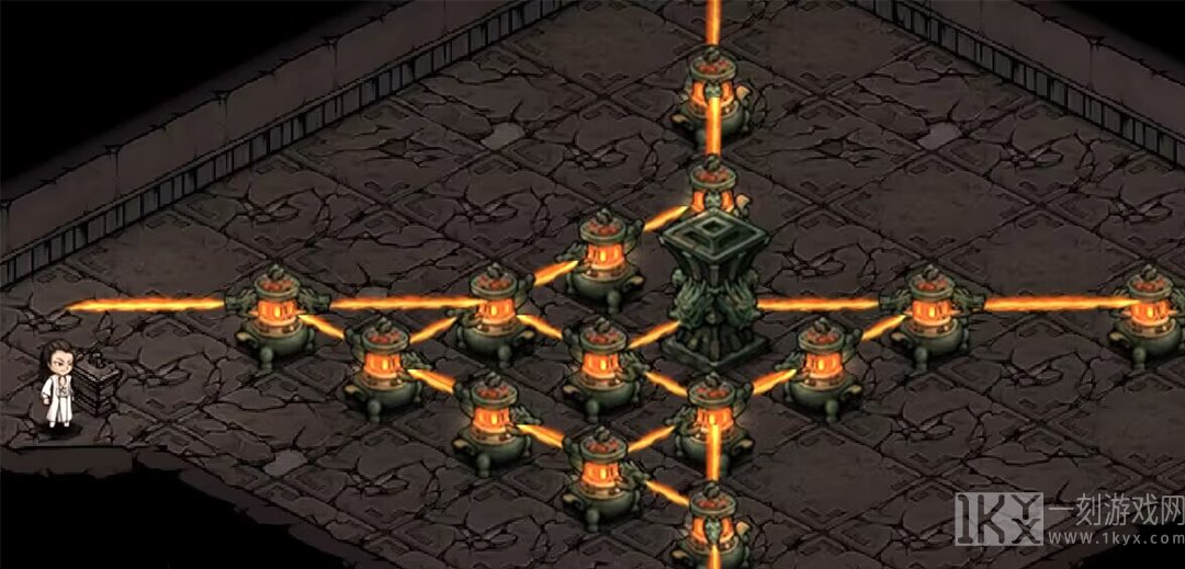 用拉杆通过中央铜柱之火引入火炉清除四角的木人。注意炉子的嘴朝向,大部分情况下按着下面图片摆就行