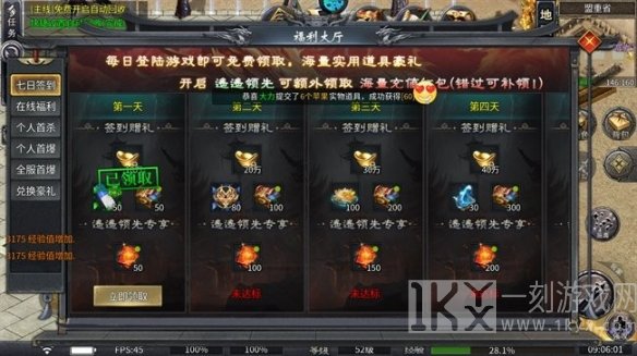 1、上线即送多重超值福利,包括井中月、噬龙伏魔钟、战神铠甲等珍稀装备,还有自动回收功能和施毒术等实用技能,让你领不停。