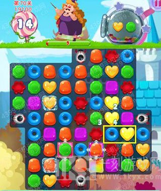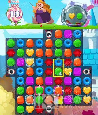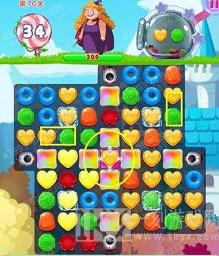 虽然本关胖女巫生命值有200,但在导弹糖果的加持下,其实难度也没想象的大。只要把中间获得加持效果做好的彩虹糖位置打通,然后把黄绿两色糖果都击中在这个地方来消除即可。