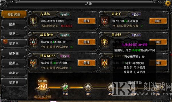 点击可以查看每日活动的开放时间以及活动玩法简介。每日完成相应任务可以获取活跃度,活跃度达到相应数量可以领取奖励(古战场时间)。每日通过完成任务可以免费获取35分钟的古战场时间。