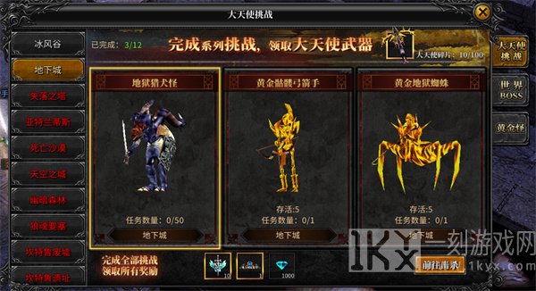 点击右上角的天使挑战即可查看任务,游戏角色达到相应等级就可以去做相应的任务获取奖励,完成大天使任务可以获得称号,钻石,大天使碎片奖励。凑够一百大天使碎片即可合成游戏内最强大的大天使武器,天使挑战累计可以免费获取两个大天使武器,分水岭在380级和1000级,完成380级前所有任务可以获取第一把大天使武器,1000级可以获取第二把大天使武器。