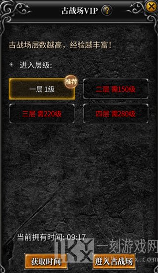 进入古战场需要消耗古战场时间,古战场内装备和爆率都比野外地图高。进去后开始打怪就会消耗时间,时间为零会自动退出古战场。点击前往按钮可以直接传送去怪物所在地。因为古战场时间有限,推荐配合加经验获取效率的道具使用——光之祝福,小熊猫等。