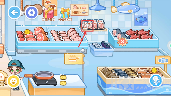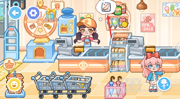 2、在商店内,根据店员上方气泡中的香肠图标,找到对应货架区域准备选取商品。