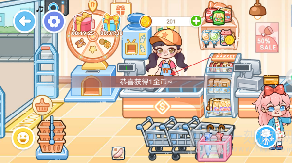 4、将商品送至收银台结账,完成交易后可获得金币(如显示【恭喜获得1金币~】),用于后续游戏操作。