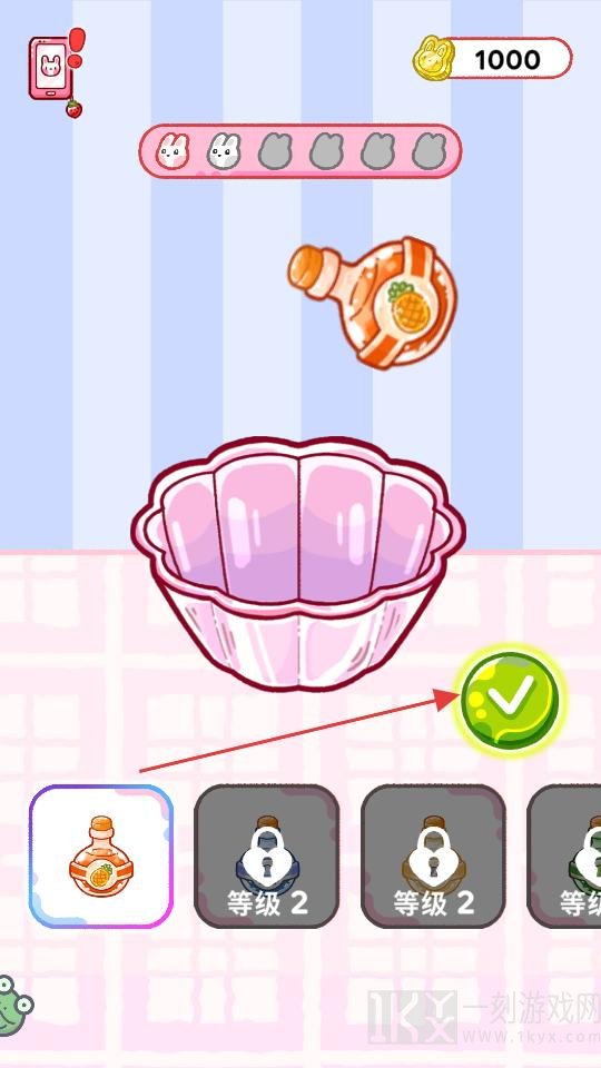 3、选择对应的材料,比如橙色的液体材料,点击绿色对勾按钮,将材料加入粉色的容器中,完成材料添加步骤。