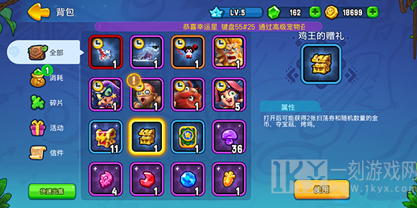玩家在背包中可查看自己拥有的碎片、消耗等道具,其中的时效宠物以及时效英雄只能使用一定的时间,但仍旧可以进行英雄觉醒。等到下次使用该英雄后会继承上次的觉醒星级,因此玩家尽管放心培养自己心仪的英雄吧!