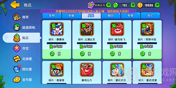 英雄皮肤可更改英雄的外观以及技能特效,所有皮肤都需要积累足够的同名皮肤碎片才能兑换。皮肤碎片可在商店内购买,售价为五钻石一个碎片,且永不下架。