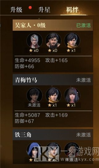 在点开伙伴页面的羁绊选项中,可以看到对应角色的羁绊组合,羁绊是该角色在原著中的人际关系,当一组羁绊中的所有角色都助战后,玩家获得额外的羁绊加成,凑齐这些原著中的组合,让自己变得更强吧!