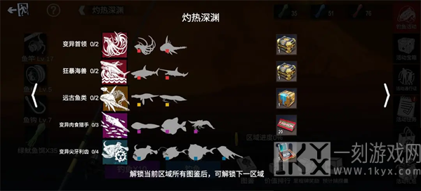 一共有6个钓鱼场景,当集齐当前场景所有鱼种后,可解锁下一个场景。越靠后场景,鱼获价值越高。解锁每个场景内的图鉴,可分别获得相应奖励,点击图鉴内已解锁图标,可查看各类鱼价值,每种鱼对应的金锚币为固定值。