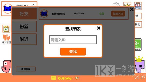 2、然后点击左侧好友管理,添加好友-输入好友id-查找,然后点击关注