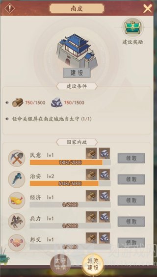 当拥有足够数量的木材石材且满足城池的建设条件后,就能消耗对应数量的建材去建设城池。在等待一段时间后,城池完成建设就可以领取相当丰厚的奖励。