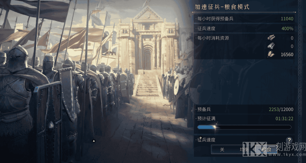 4.在募兵所打开粮食加速来加快征兵速度,通过任务获得的面包(恢复体力道具)喂给桃园队。