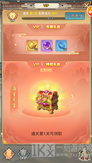 1、登录游戏通关第1关,就可以领取一个vip1特权礼包