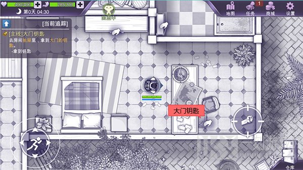 大门钥匙在如下图的位置,抽屉里面。这里记得顺便把衣柜也搜索了,可以捡到一双【麻布鞋子】,装备上后就可以加速跑了。