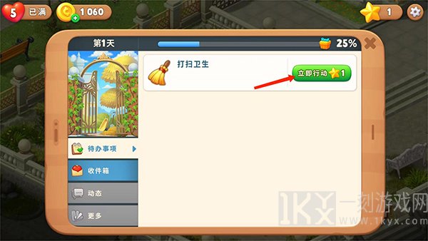 5、出现打扫卫生的任务了,选择【立即行动】选项;