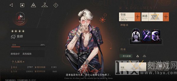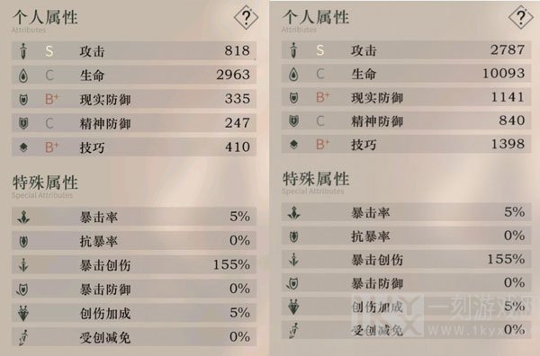 先来比一下个人属性:左侧是狼群1级的面板,右侧是狼群洞悉一30级的面板。