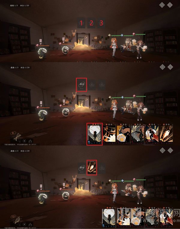 每回合的行动次数视在场人数而定。如图所示,我方当前场上有三人。所以本回合我们可以行动三次。每次选择使用或者移动卡牌都需要消耗一点行动点。