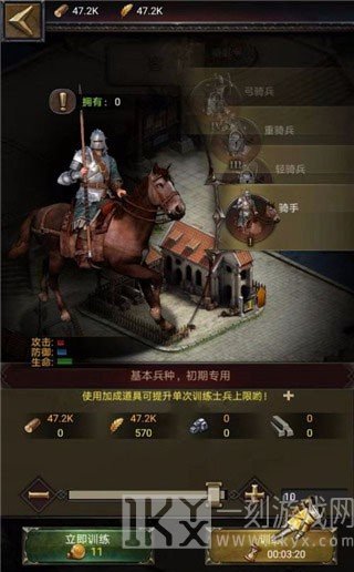 3、拥有足够的粮食,就可以建造属于自己的军队,可以训练骑手、轻骑兵、重骑兵、弓骑兵,使用加成道具可提升单次训练士兵,如图所示