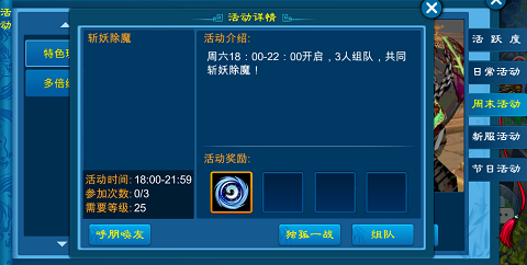 周六18:00-22:00开启,3人组队,共同斩妖除魔。可获得大量灵气,还等什么极品装备就靠它了。