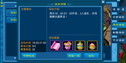 周日18:00-22:00开启,3人组队,共同破解白莲阵法!有大量极品仙宠,灵南仙果,天赋仙书4阶卷轴等你来拿。