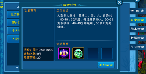 每周二、四、六可参加,满10人可开战!可享受酣畅淋漓的群体PK,激情畅爽的无阵营群体大乱斗,这里未必是强者的天下,弱者也可偷袭。可获得海量经验和荣誉。