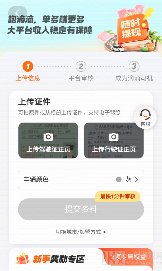 4、之后上传你的驾驶证正页和行驶证正页,选择车辆颜色,点击提交资料。