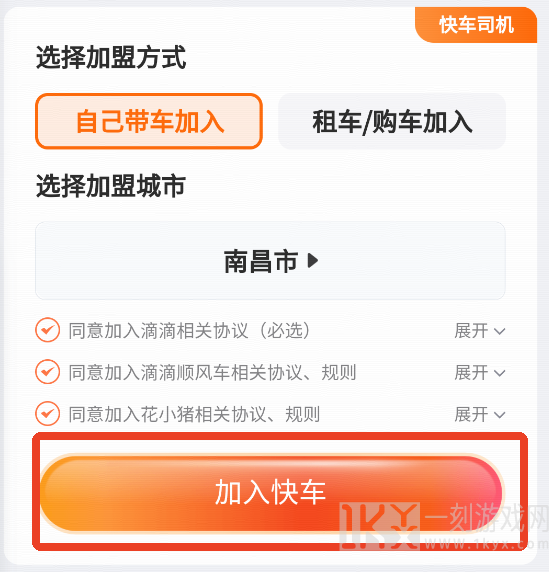 3、我们以快车为例,选择你的加盟方式和加盟城市,然后同意下面三个规则,点击加入快车。