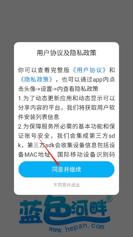 2、进入后阅读并同意蓝色河畔app的用户协议